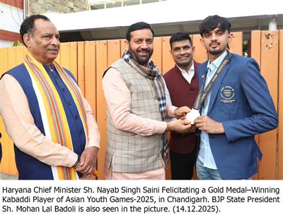Chandigarh, December 14 – Chief Minister Sh. Nayab Singh Saini today met a delegation of Haryana players from the Indian boys’ and girls’ Kabaddi teams which won gold medals at the Asian Youth Games-2025 held in Bahrain. The meeting was held at his residence, Sant Kabir Kutir in Chandigarh. On this occasion, the Chief Minister congratulated the players and extended his best wishes to Captain Ishant Rathee and other players, warmly welcoming and felicitating them for their historic achievement.