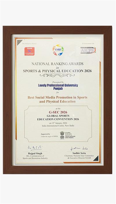Jalandhar, 29.01.26-; In a moment of national recognition for excellence in sports education, Lovely Professional University (LPU) has achieved a remarkable double victory at the prestigious Global Sports Education Convention (G-SEC) 2026, receiving the National Ranking Award for Sports & Physical Education in two distinguished categories. LPU was honoured with the awards for “Best Social Media Promotion in Sports and Physical Education” and the “Best Indoor Sports Facility” by the Confederation of Sports and Recreation Industry (CSRI). The awards were presented at a ceremony organised in collaboration with the Ministry of Youth Affairs and Sports, Government of India, recognising LPU’s holistic leadership in shaping the future of sports in the country.