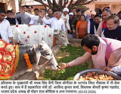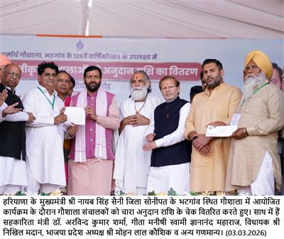 Chandigarh, March 3 - Haryana Chief Minister, Sh. Nayab Singh Saini released Rs. 68.34 crore fodder grant for the empowerment of gaushalas in the state at a State-Level Gaushala Fodder Grant Distribution programme held in village Bhatgaon, Sonipat. On the occasion, he also extended greetings to the people of the state on the festival of Holi.